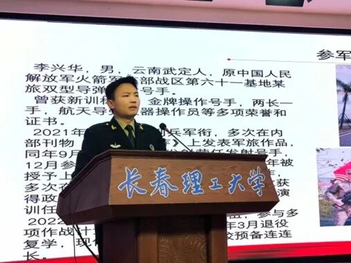 李兴华,曾服役于火箭军某部队,退役复学后就读于长春理工大机电工程学院机械电子工程专业,复学后担任我校大学生预备连连长,橄榄营副营长,本班团支书,积极参与学校各项爱国主义教育和征兵活动。